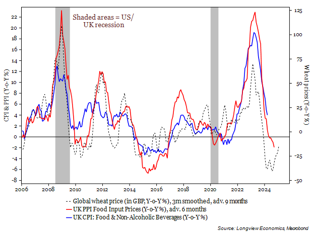 Fig 2: Wheat price & UK Food PPI (adv. 9m & 6m) vs. UK Food CPI (Y-o-Y %)