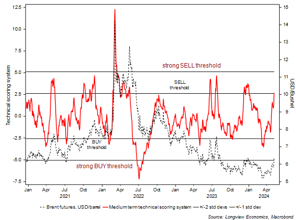 The message of our wheat price models, in that respect, is mixed. Our medium term technical scoring system, for example, is now on SELL (suggesting that wheat prices are overextended to the upside, see fig 4). Sentiment, though, remains broadly bearish, and speculators are net SHORT wheat futures (despite having reduced SHORT positioning significantly in recent weeks, see fig 1).