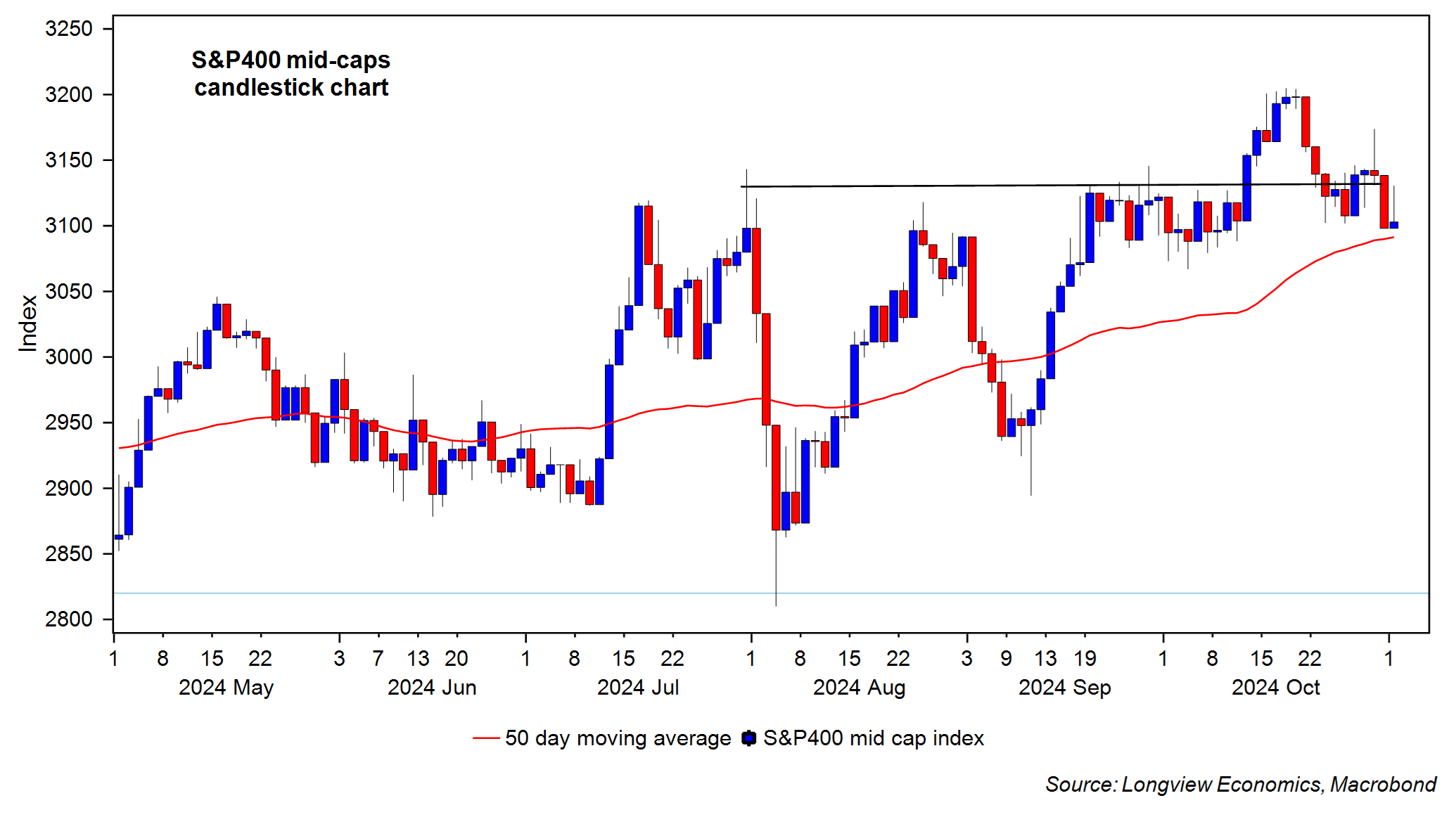 The first thing to consider is what’s been driving the market. Why is it where it is, and what’s behind recent moves? What’s the explanation? If you listen to mainstream media, you’d be fairly confident it was the "Trump trade." You can see in this chart that betting odds have improved dramatically over the course of October, at least up until this weekend. That has been the narrative: the "Trump trade" is driving bond yields higher, leading to a stronger dollar and pushing up the equity market. But if you look at the actual data, it’s not that clear. The S&P 500, since the end of September, is flat. The Nasdaq 100, since the end of September, is flat. And even more cyclically sensitive, domestically focused equity market indices like the S&P 400 and S&P 600—representing mid-caps and small caps in the US—are also flat.