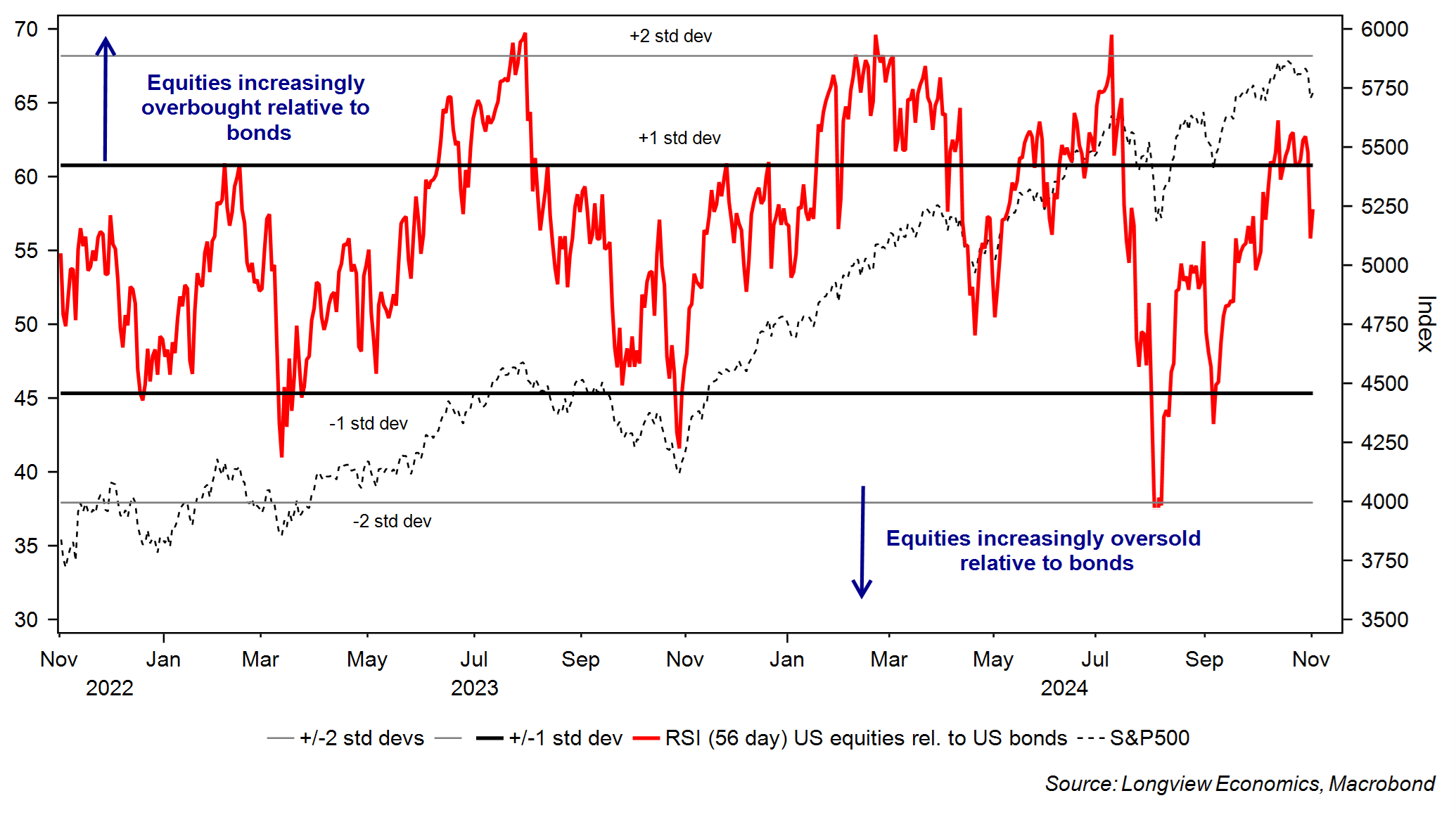 In other words, the equity market hasn’t really been responding; it’s been struggling and losing momentum. Indeed, even looking at bonds, one alternative narrative is that if Trump is elected and gains control of Congress and the Senate, it will be easier for him to push through another fiscal stimulus package. That would be positive for the cyclical side of the economy, at least for the next year or two, so no wonder bond yields are backing up. But, as I mentioned, there’s an alternative narrative. Look at our model of the relative strength of equities versus bonds in the US on a medium-term, multi-month basis. Going back to early August, equities were oversold after that pullback, while bonds were overbought. The bond prices had been rallying, and yields were low. Over the last couple of months, we've seen a reversal of that trade. This has essentially been an asset allocation switch, leaving us at the opposite end now: bond yields have backed up, prices have sold off, bonds are oversold, and equities were overbought until recently.